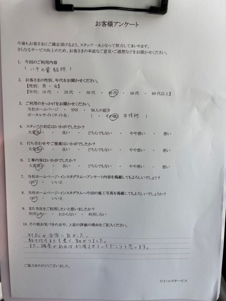とお喜びの声をいただきました。今回はご連絡をいただいてから約30分でお伺いしました。蜂は危険なのでなるべく早い対応を心がけております。